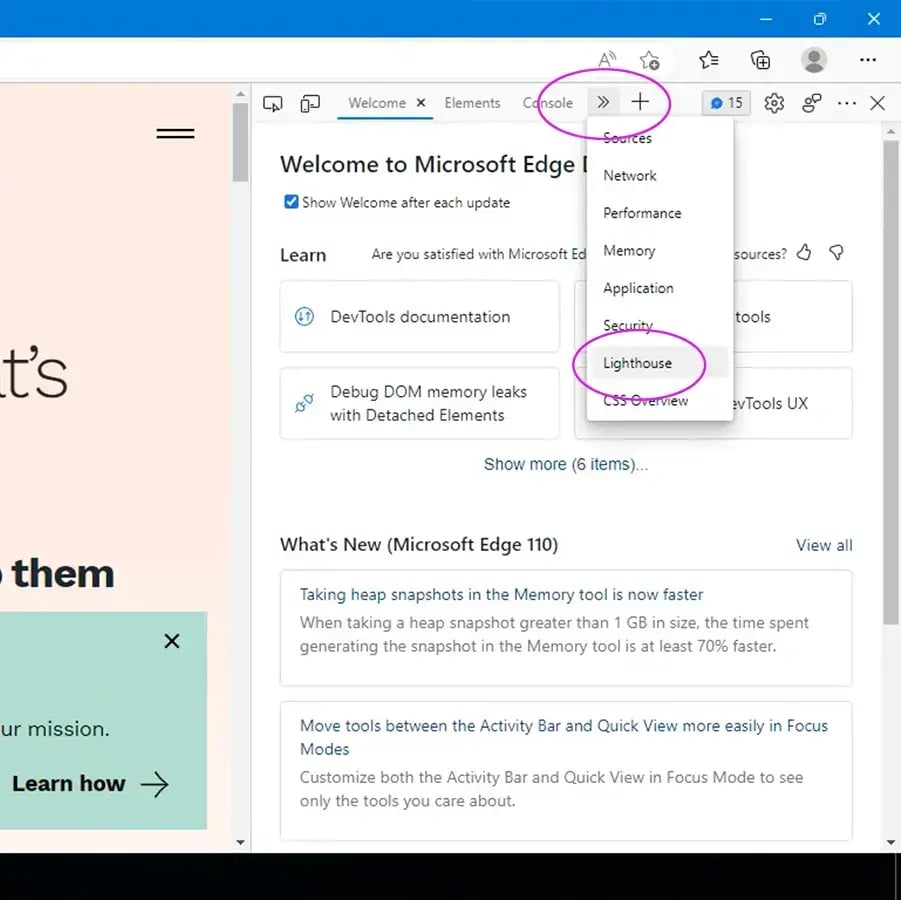 Microsoft Edge with path to Lighthouse tools highlighted, where you can test your website load speed.